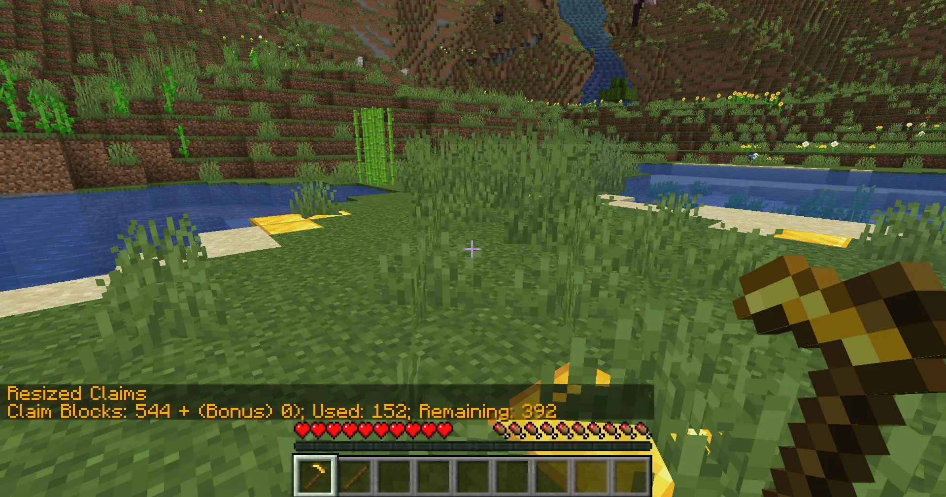 Section titled “Resizing a claim”To resize your claim, get a Golden Hoe and a Stick by crafting them or running /kit claim ck and selecting the claim kit (the golden hoe).